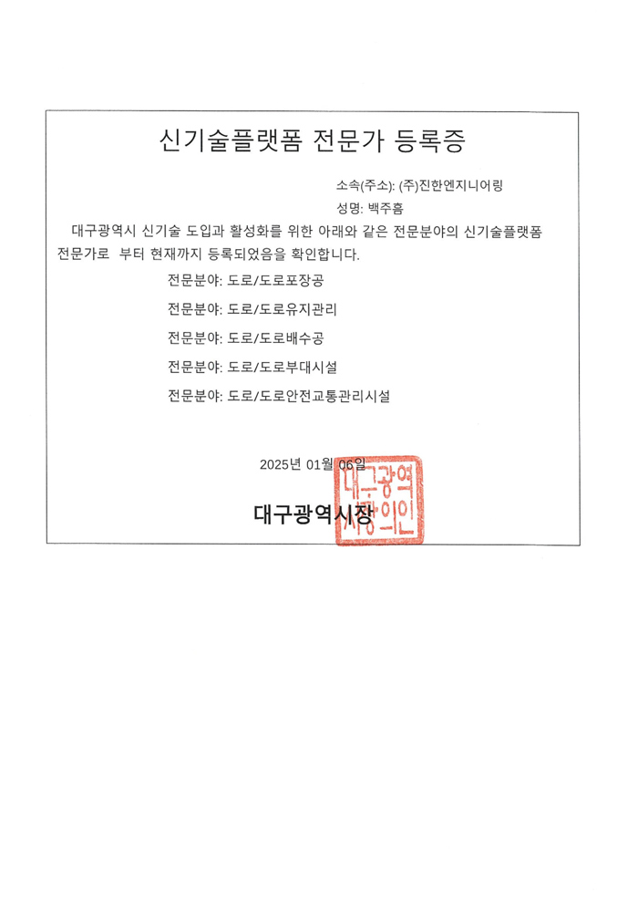 대구광역시 신기술플랫폼전문가 등록증