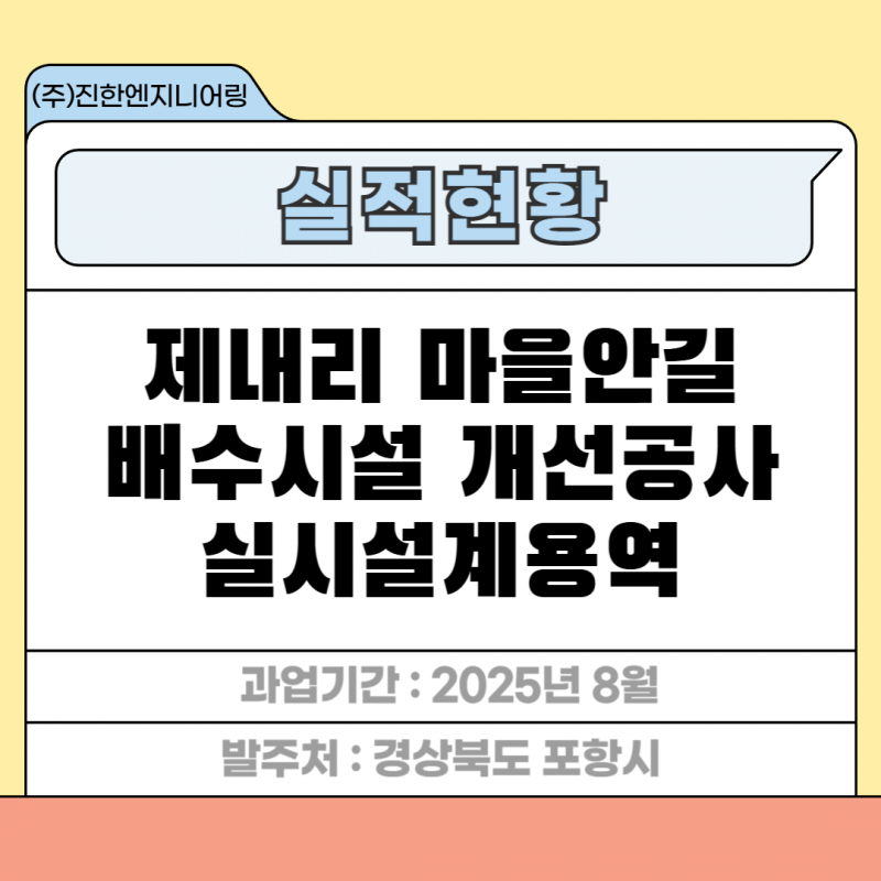 제내리 마을안길 배수시설 개선공사 실시설계 용역 페이지 정보 작성자 최고관리자 작성일25-12-11 17:23 조회23회 관련링크 이전글 다음글 목록 답변 본문 세부분야 : 실시설계 발주처 : 경상북도 포항시 과업기간 : 2025년 8월 제내리 마을안길 배수시설 개선공사 실시설계 용역 이전글 다음글 목록 답변