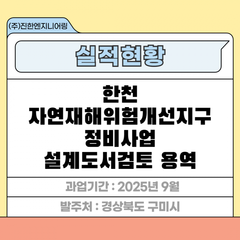 한천 자연재해위험개선지구 정비사업 설계도서검토 용역 페이지 정보 작성자 최고관리자 작성일26-01-16 15:06 조회12회 관련링크 이전글 다음글 목록 답변 본문 세부분야 : 설계도서검토 발주처 : 경상북도 구미시 과업기간 : 2025년 9월 한천 자연재해위험개선지구 정비사업 설계도서검토 용역 이전글 다음글 목록 답변