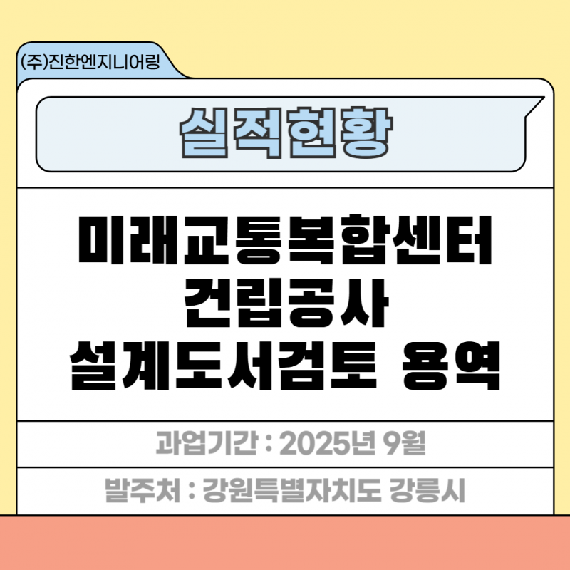 미래교통복합센터 건립공사 설계도서검토 용역 페이지 정보 작성자 최고관리자 작성일26-01-16 15:07 조회11회 관련링크 이전글 다음글 목록 답변 본문 세부분야 : 설계도서검토 발주처 : 강원특별자치도 강릉시 과업기간 : 2025년 9월 미래교통복합센터 건립공사 설계도서검토 용역 이전글 다음글 목록 답변