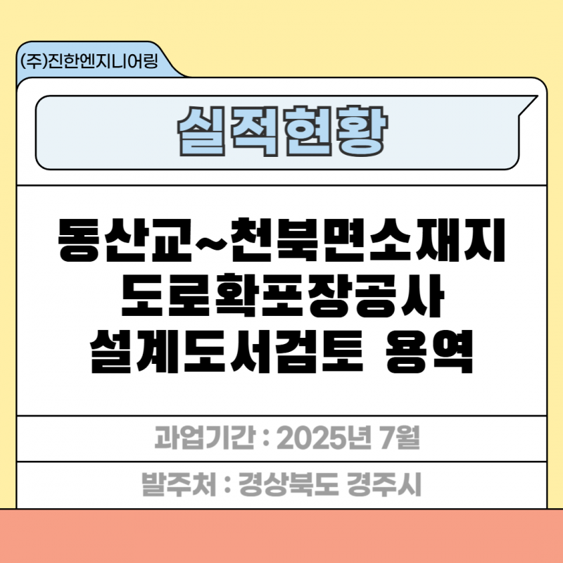 동산교~천북면 소재지 도로확포장공사 설계도서검토 용역 페이지 정보 작성자 최고관리자 작성일25-12-01 17:42 조회26회 관련링크 이전글 다음글 목록 답변 본문 세부분야 : 설계도서검토 발주처 : 경상북도 경주시 과업기간 : 2025년 7월 동산교~천북면 소재지 도로확포장공사 설계도서검토 용역 이전글 다음글 목록 답변