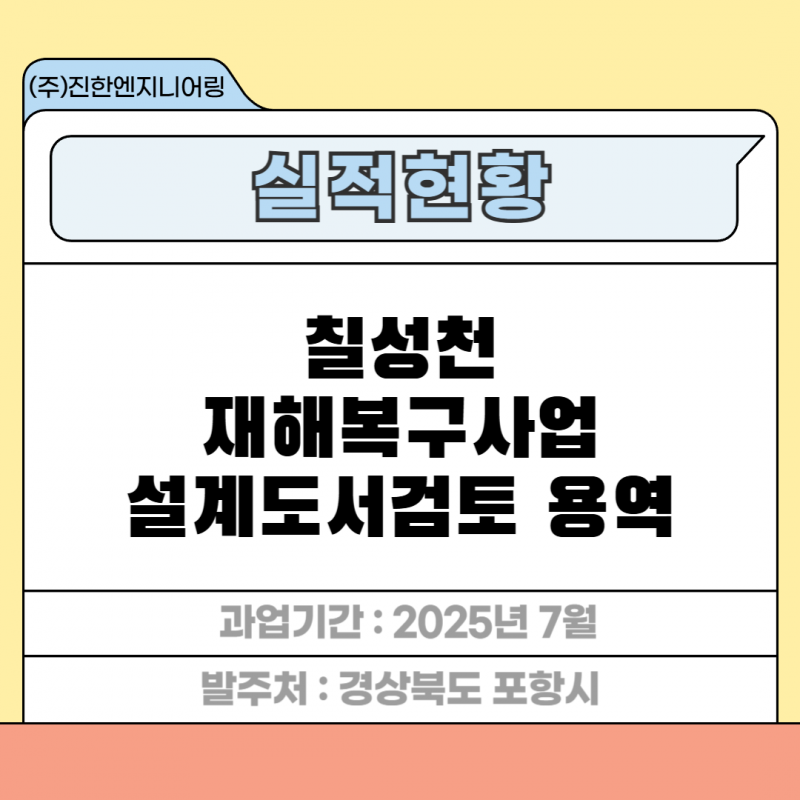 칠성천 재해복구사업 설계도서검토 용역 페이지 정보 작성자 최고관리자 작성일25-12-01 17:47 조회22회 관련링크 이전글 다음글 목록 답변 본문 세부분야 : 설계도서검토 발주처 : 경상북도 포항시 과업기간 : 2025년 7월 칠성천 재해복구사업 설계도서검토 용역 이전글 다음글 목록 답변