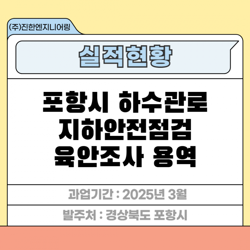 포항시 하수관로 지하안전점검 육안조사 용역 페이지 정보 작성자 최고관리자 작성일25-07-07 16:45 조회50회 관련링크 이전글 다음글 목록 답변 본문 세부분야 : 육안조사 발주처 : 경상북도 포항시 과업기간 : 2025년 3월 포항시 하수관로 지하안전점검 육안조사 용역 이전글 다음글 목록 답변