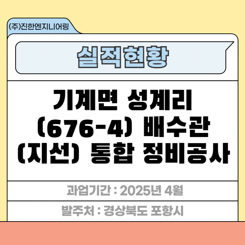 기계면 성계리(676-4) 배수관(지선) 통합 정비공사 페이지 정보 작성자 최고관리자 작성일25-08-11 15:56 조회47회 관련링크 이전글 다음글 목록 답변 본문 세부분야 : 실시설계 발주처 : 경상북도 포항시 과업기간 : 2025년 4월 기계면 성계리(676-4) 배수관(지선) 통합 정비공사 이전글 다음글 목록 답변