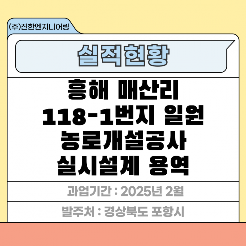 흥해 매산리 118-1번지 일원 농로개설공사 실시설계 용역 페이지 정보 작성자 최고관리자 작성일25-03-04 17:59 조회68회 관련링크 이전글 다음글 목록 답변 본문 세부분야 : 실시설계 발주처 : 경상북도 포항시 과업기간 : 2025년 2월 흥해 매산리 118-1번지 일원 농로개설공사 실시설계 용역 이전글 다음글 목록 답변