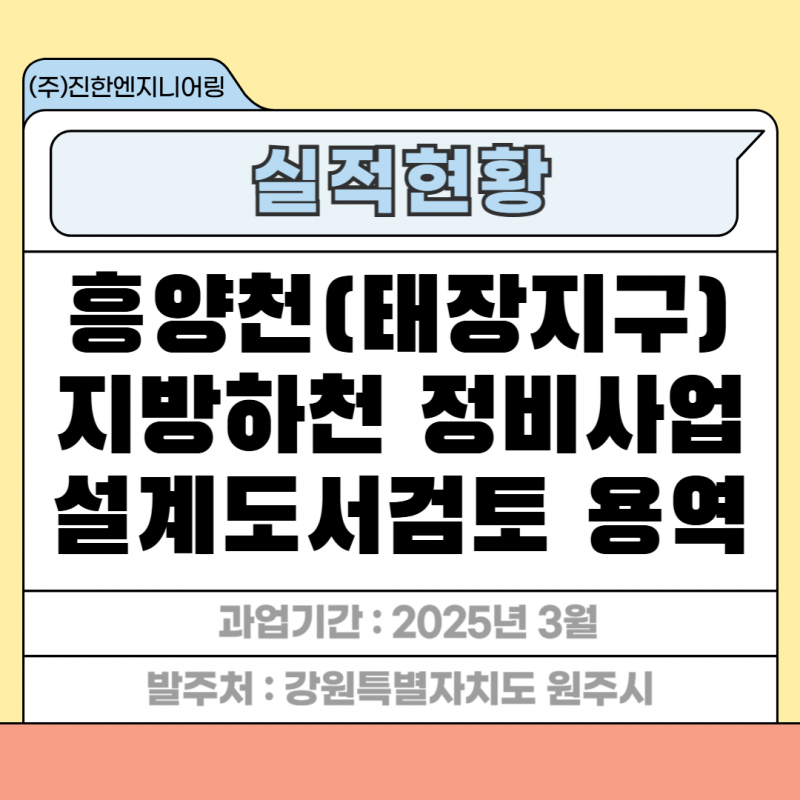흥양천(태장지구) 지방하천 정비사업 설계도서검토 용역 페이지 정보 작성자 최고관리자 작성일25-07-07 16:41 조회46회 관련링크 이전글 다음글 목록 답변 본문 세부분야 : 수자원개발 발주처 : 강원특별자치도 원주시 과업기간 : 2025년 3월 흥양천(태장지구) 지방하천 정비사업 설계도서검토 용역 이전글 다음글 목록 답변