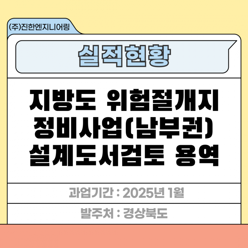 지방도 위험절개지 정비사업(남부권) 설계도서검토 용역 페이지 정보 작성자 최고관리자 작성일25-03-04 17:34 조회43회 관련링크 이전글 다음글 목록 답변 본문 세부분야 : 도로 발주처 : 경상북도 과업기간 : 2025년 1월 지방도 위험절개지 정비사업(남부권) 설계도서검토 용역 이전글 다음글 목록 답변