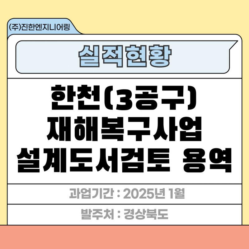 한천(3공구) 재해복구사업 설계도서검토 용역 페이지 정보 작성자 최고관리자 작성일25-03-04 17:38 조회39회 관련링크 이전글 다음글 목록 답변 본문 세부분야 : 수자원개발 발주처 : 경상북도 과업기간 : 2025년 1월 한천(3공구) 재해복구사업 설계도서검토 용역 이전글 다음글 목록 답변