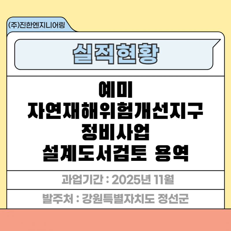 예미 자연재해위험개선지구 정비사업 설계도서검토 용역 페이지 정보 작성자 최고관리자 작성일26-03-12 15:01 조회3회 관련링크 이전글 다음글 목록 답변 본문 세부분야 : 설계도서검토 발주처 : 강원특별자치도 정선군 과업기간 : 2025년 11월 예미 자연재해위험개선지구 정비사업 설계도서검토 용역 이전글 다음글 목록 답변