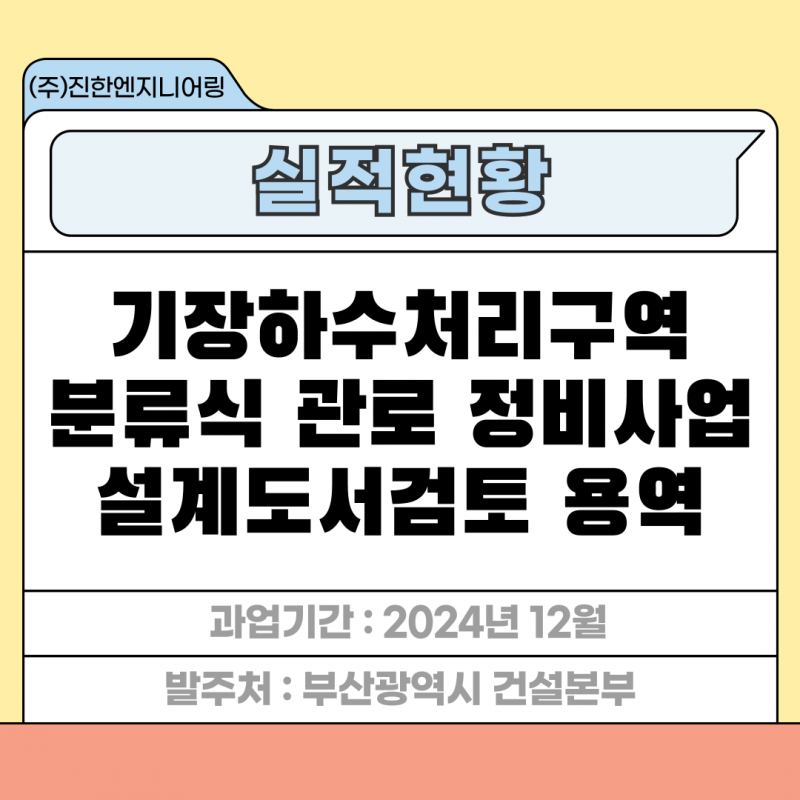 기장하수처리구역 분류식 관로 정비사업 설계도서검토 용역 페이지 정보 작성자 최고관리자 작성일25-03-04 17:26 조회47회 관련링크 이전글 다음글 목록 답변 본문 세부분야 : 상하수도 발주처 : 부산광역시 건설본부 과업기간 : 2024년 12월 기장하수처리구역 분류식 관로 정비사업 설계도서검토 용역 이전글 다음글 목록 답변