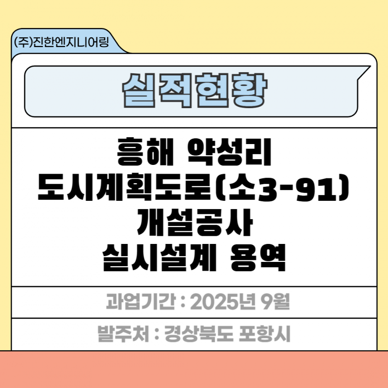 흥해 약성리 도시계획도로(소3-91) 개설공사 실시설계 용역 페이지 정보 작성자 최고관리자 작성일26-01-16 15:11 조회12회 관련링크 이전글 다음글 목록 답변 본문 세부분야 : 실시설계 발주처 : 경상북도 포항시 과업기간 : 2025년 9월 흥해 약성리 도시계획도로(소3-91) 개설공사 실시설계 용역 이전글 다음글 목록 답변