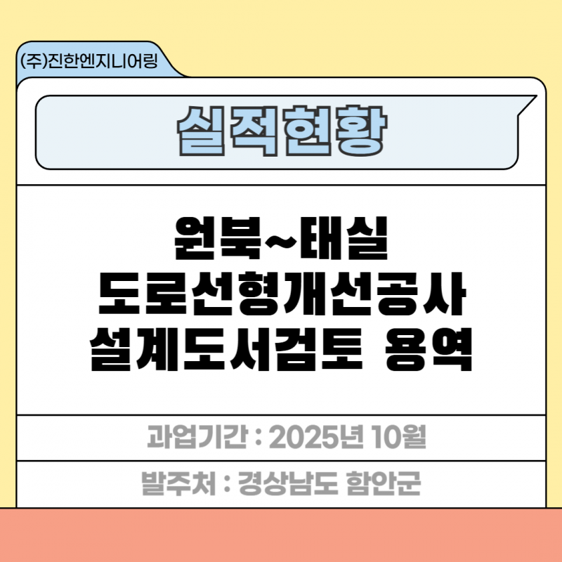 원북~태실 도로 선형 개선공사 설계도서검토 용역 페이지 정보 작성자 최고관리자 작성일26-02-12 11:20 조회4회 관련링크 이전글 다음글 목록 답변 본문 세부분야 : 설계도서검토 발주처 : 경상남도 함안군 과업기간 : 2025년 10월 원북~태실 도로 선형 개선공사 설계도서검토 용역 이전글 다음글 목록 답변
