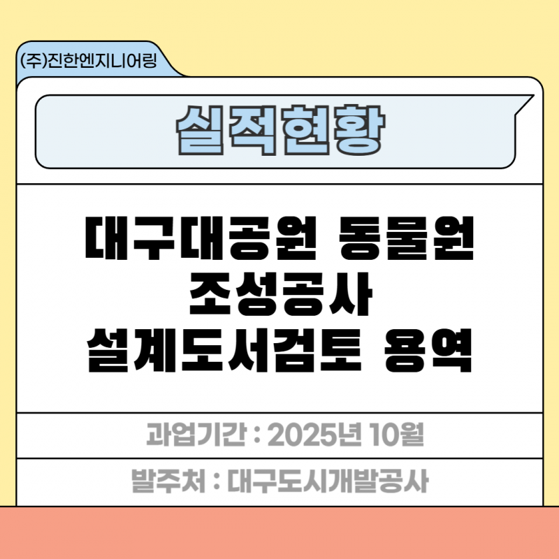 대구대공원 동물원 조성공사 설계도서검토 용역 페이지 정보 작성자 최고관리자 작성일26-02-12 11:21 조회2회 관련링크 이전글 다음글 목록 답변 본문 세부분야 : 설계도서검토 발주처 : 대구도시개발공사 과업기간 : 2025년 10월 대구대공원 동물원 조성공사 설계도서검토 용역 이전글 다음글 목록 답변