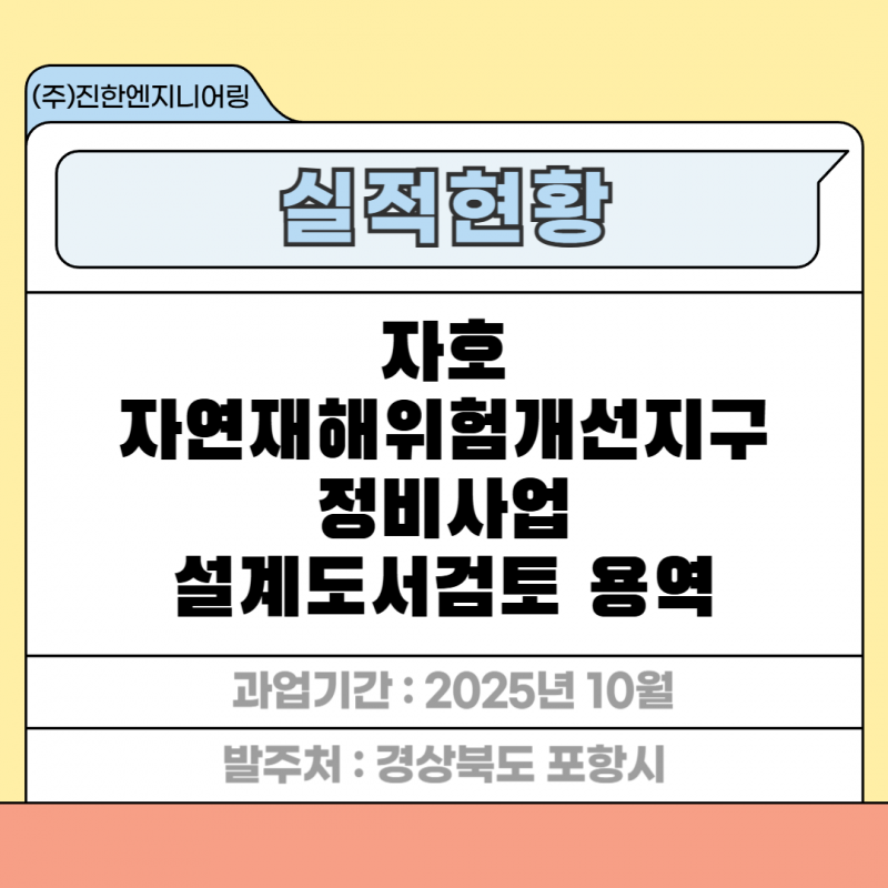 자호 자연재해위험개선지구 정비사업 설계도서검토 용역 페이지 정보 작성자 최고관리자 작성일26-02-12 11:23 조회3회 관련링크 이전글 다음글 목록 답변 본문 세부분야 : 설계도서검토 발주처 : 경상북도 포항시 과업기간 : 2025년 10월 자호 자연재해위험개선지구 정비사업 설계도서검토 용역 이전글 다음글 목록 답변