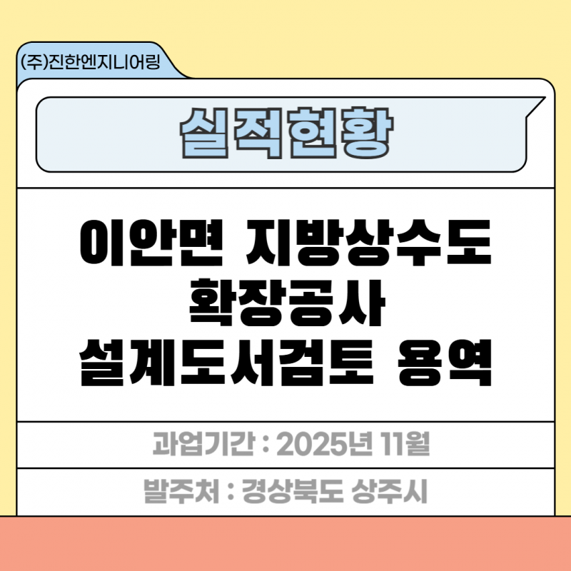 이안면 지방상수도 확장공사 설계도서검토 용역 페이지 정보 작성자 최고관리자 작성일26-03-12 15:09 조회4회 관련링크 이전글 다음글 목록 답변 본문 세부분야 : 설계도서검토 발주처 : 경상북도 상주시 과업기간 : 2025년 11월 이안면 지방상수도 확장공사 설계도서검토 용역 이전글 다음글 목록 답변